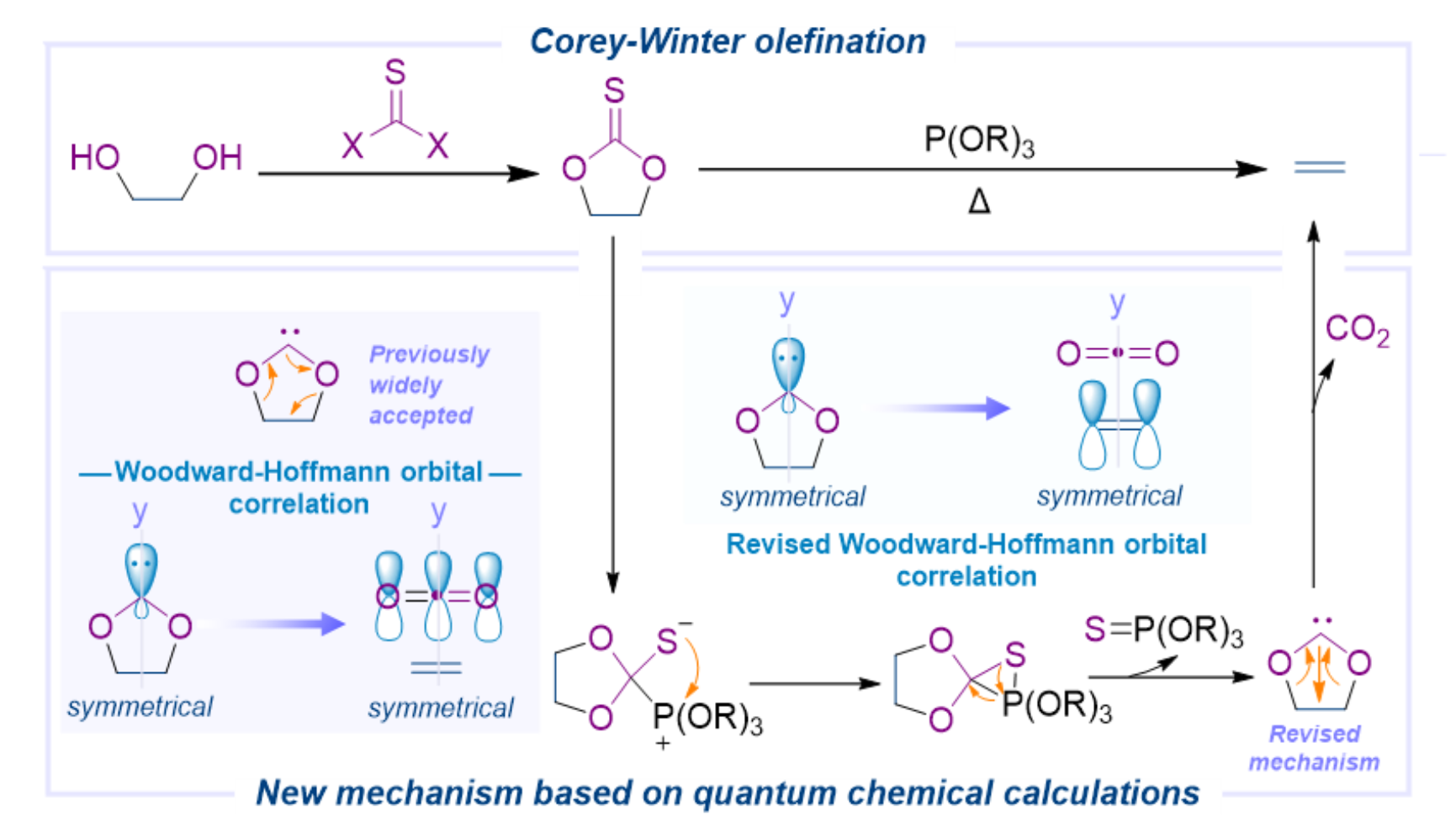 对于这一机理难题,北京大学余志祥教授课题组利用量子化学计算以及多参数线性拟合等手段,详细地研究了Corey-Winter的机理,并提出了新的反应路径(图2)。有别于其他所有机理,在他们新提出的路径中,亚磷酸三烷基酯首先进攻硫代碳酸酯的碳原子而非硫原子,生成偶极子;随后该偶极子发生分子内环化,生成螺环;螺环直接发生环消除生成卡宾以及硫代磷酸酯;卡宾最后经历协同的逆周环反应生成烯烃和二氧化碳。与此同时,他们还成功地解释了前人的机理实验,提出了模型解释了为什么P1能大大降低反应温度,修正了逆环化过程的电子流动模式以及逆环化过程的Woodward-Hoffmann轨道相关图。