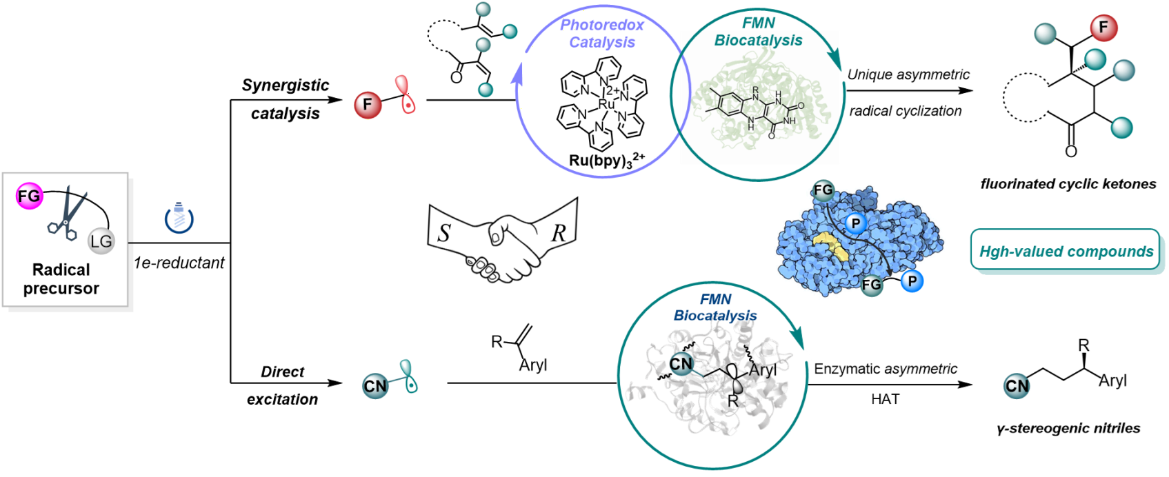 过去数十年里,生物催化蓬勃发展,已经成为一种高效、实用和绿色可持续性的化学合成策略,并逐渐在合成化学中得到更多应用,与传统的金属和有机催化一起共同推动合成化学的发展。生物催化取得广泛应用的一个重要驱动力便是不断发现或发展具有新的催化能力的酶,从而扩大生物催化工具箱。借助光催化领域基于自由基中间体的激活转化模式,将其与酶催化结合的光酶催化,近年来成为开发新酶功能的前沿领域。