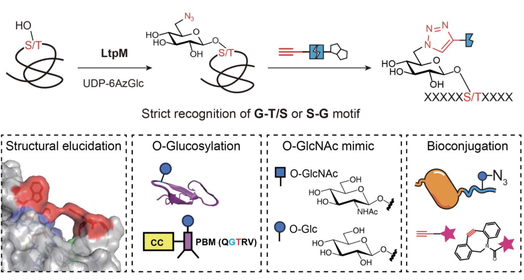 LtpM 独特的两氨基酸识别序列(G-T/S、S-G)使其成为一种有力的糖基化研究工具,在包括天然 Notch 蛋白在内的众多靶蛋白底物上实现了位点特异性 β-O-Glc 标记。对于不符合该识别序列的目标修饰位点,可通过插入或突变单个甘氨酸残基实现修饰,减少了引入长识别序列带来潜在蛋白结构干扰。基于对糖基供体底物修饰的容忍性,使用 UDP-6AzGlc 作为糖基供体,LtpM实现了位点特异性地向目标蛋白质引入生物正交基团并进一步偶联各种功能探针,为生物偶联提供了新方法。