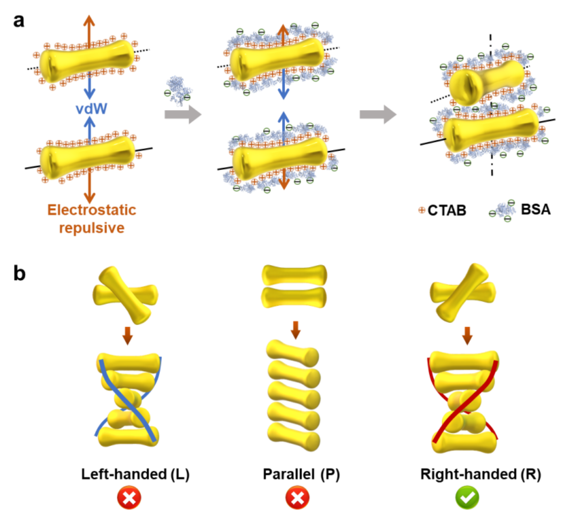 如图1 所示,利用生物分子牛血清白蛋白(BSA)作为手性添加剂,诱导由十六烷基三甲基溴化铵稳定的金纳米哑铃(GNDs)在溶液中发生扭转的“肩并肩”自组装,从而形成手性组装体。引入BSA 分子后,带负电荷的生物分子吸附在带正电荷的GNDs 表面,使得静电排斥显著降低,导致GNDs 发生组装。GNDs 的凹形形貌和互锁倾向有利于形成具有手性特征的扭转堆叠组装体,以使得范德华吸引能最大化。BSA 修饰的GNDs 侧表面的手性电荷分布,可能导致GNDs 间发生特定方向的扭转,并且倾向于诱导形成右旋的组装体。