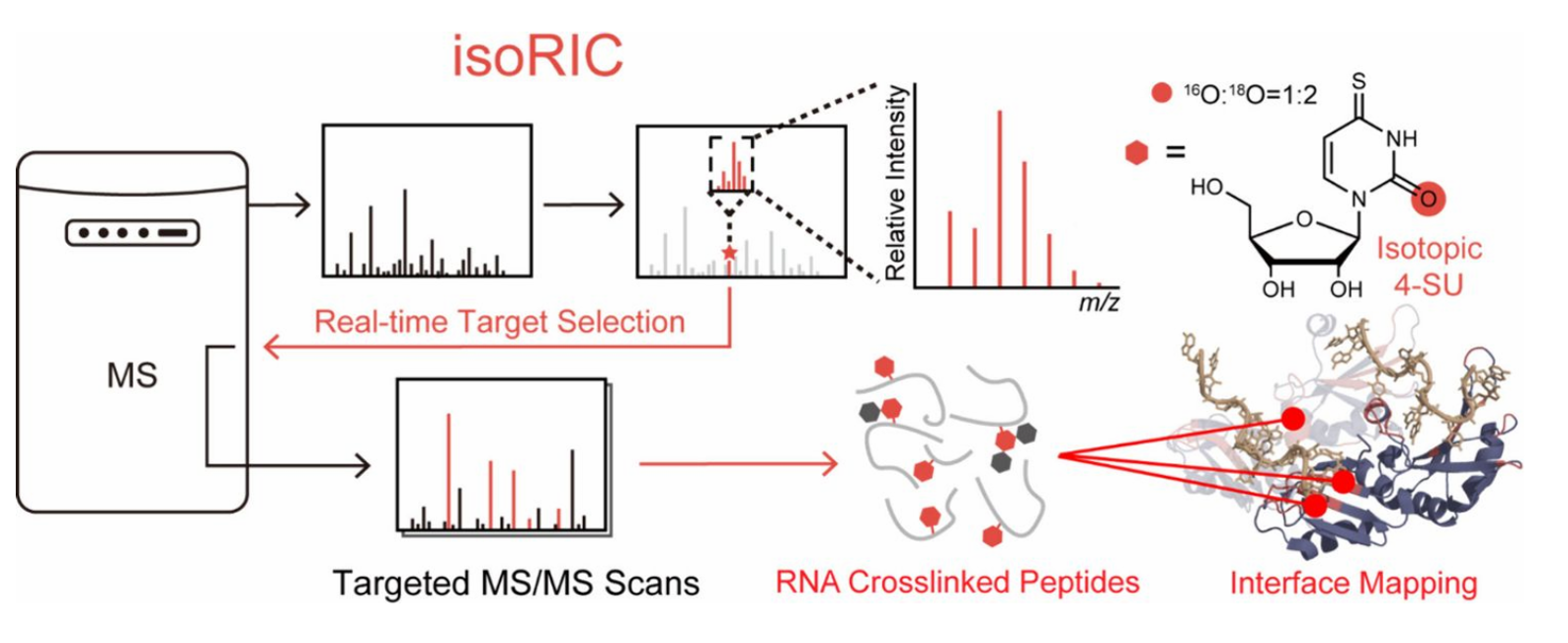 面对上述挑战,作者将课题组此前开发的实时同位素信号靶向分析技术(isoSTAR)(J. Am. Chem. Soc. 2025, 147, 9, 7513–7523)与同位素编码的非天然核苷代谢标记相结合,开发了同位素靶向的RNA互作位点鉴定(isoRIC)的新方法。首先,作者设计并合成了在尿嘧啶2-O位进行部分18O取代(16O: 18O = 1:2)的光活性核苷4-硫代尿苷(4-SU)。这种同位素4-SU能够被细胞代谢并掺入新合成的RNA中。当用紫外光诱导RNA与蛋白质交联后,所有与RNA交联的肽段都会携带上一个独特的“分子身份证”——一个分子量+2 Da的稳定同位素质量偏移特征。其后,利用同位素编码靶向的isoSTAR技术即可实时监控质谱一级谱(MS1),一旦检测到带有上述特定同位素特征的离子,系统会立即触发二级质谱(MS/MS)扫描,实现对目标交联肽段的“精准打击”。这种策略彻底摆脱了对离子强度的依赖,使得即使含量极低的交联肽段也会被精准靶向鉴定。