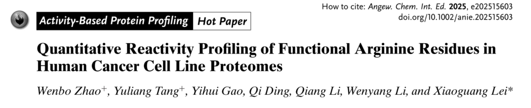 Wenbo Zhao, Yuliang Tang, Yihui Gao, Qi Ding, Qiang Li, Wenyang Li, Xiaoguang Lei* “Quantitative Reactivity Profiling of Functional Arginine Residues in Human Cancer Cell Line Proteomes”Angew. Chem. Int. Ed. Engl. 2025, doi:10.1002/anie.202515603