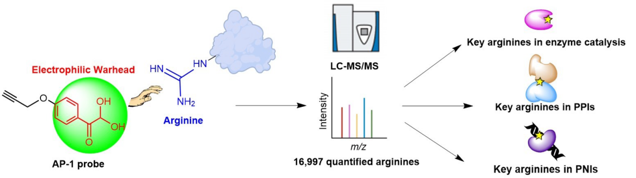 带有胍基侧链的精氨酸,作为蛋白质中一种关键的基本氨基酸,在酶催化、大分子相互作用、能量代谢及免疫调节等生命过程中都发挥着不可替代的重要作用。然而,相较于半胱氨酸、赖氨酸等其它亲核氨基酸,精氨酸的化学反应性较低,难以实现对其高选择性的共价标记。尽管已有一些化学探针被开发用于精氨酸标记,但其在复杂的蛋白质组环境中进行全局性、定量分析的能力仍然有限,这导致在系统研究精氨酸在蛋白质发挥功能中的作用时面临着巨大挑战。