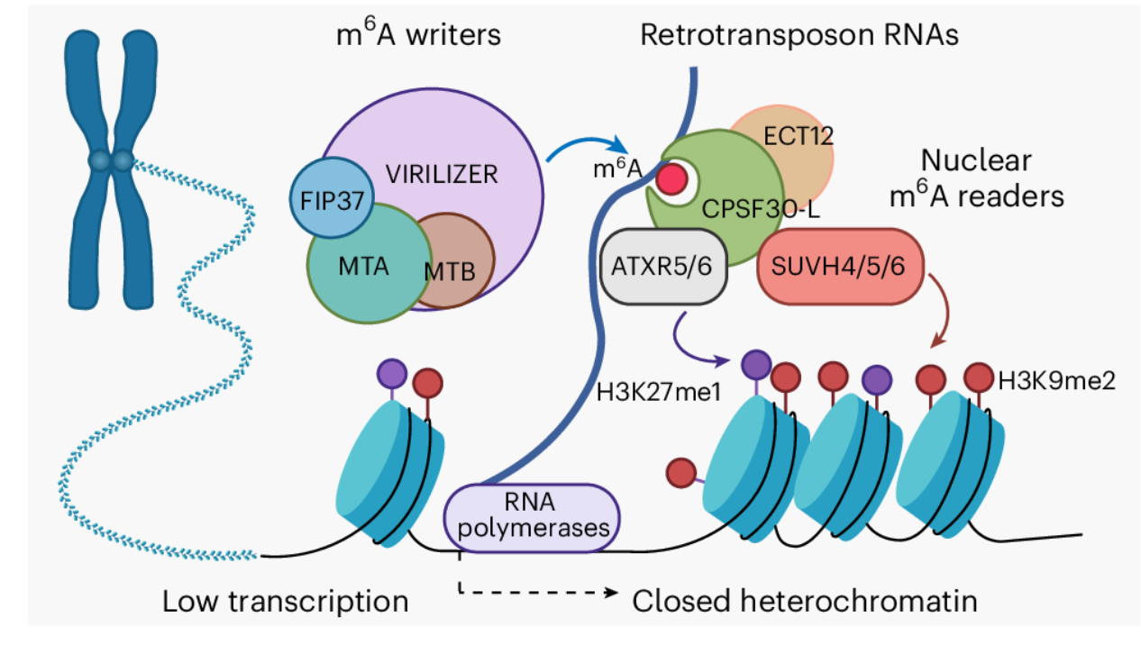 在植物基因组这片广袤的“荒原”中,转座子(transposon)宛如不安分的“游牧者”,随时可能跳跃、插入,扰乱基因组的秩序。在玉米、稻米等作物中,转座子序列占据了基因组的60%至80%。尽管大多数转座子在正常情况下被沉默,但在环境胁迫或表观调控失衡时,它们可能被重新激活,干扰基因表达甚至威胁基因组稳定。为维持基因组的稳定与沉默,植物演化出多层次表观遗传调控机制,依靠H3K9me2、H3K27me1等组蛋白修饰建立异染色质状态,限制转座子转录。然而,RNA层面的表观修饰是否也参与调控染色质结构与转录活性,长期以来仍是未解之谜。