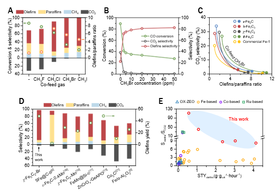 通过在合成气中引入百万分之一(ppm)浓度的溴甲烷(CH3Br),研究团队实现了对铁基催化剂表面反应路径的精准控制。实验结果显示,ppm级别的溴甲烷就可以将生成CO2的反应路径关闭,CO2的生成选择性从传统的30%左右降低至不足1%,几乎实现“零排放”;同时,目标产物——烯烃的选择性显著提高至85%左右,烯烃/烷烃比值更是达到约13。这一策略不仅解决了长期困扰铁基FTS的高CO2副产率问题,也打破了高烯烃时空产率与低碳排放之间难以兼得的技术壁垒。