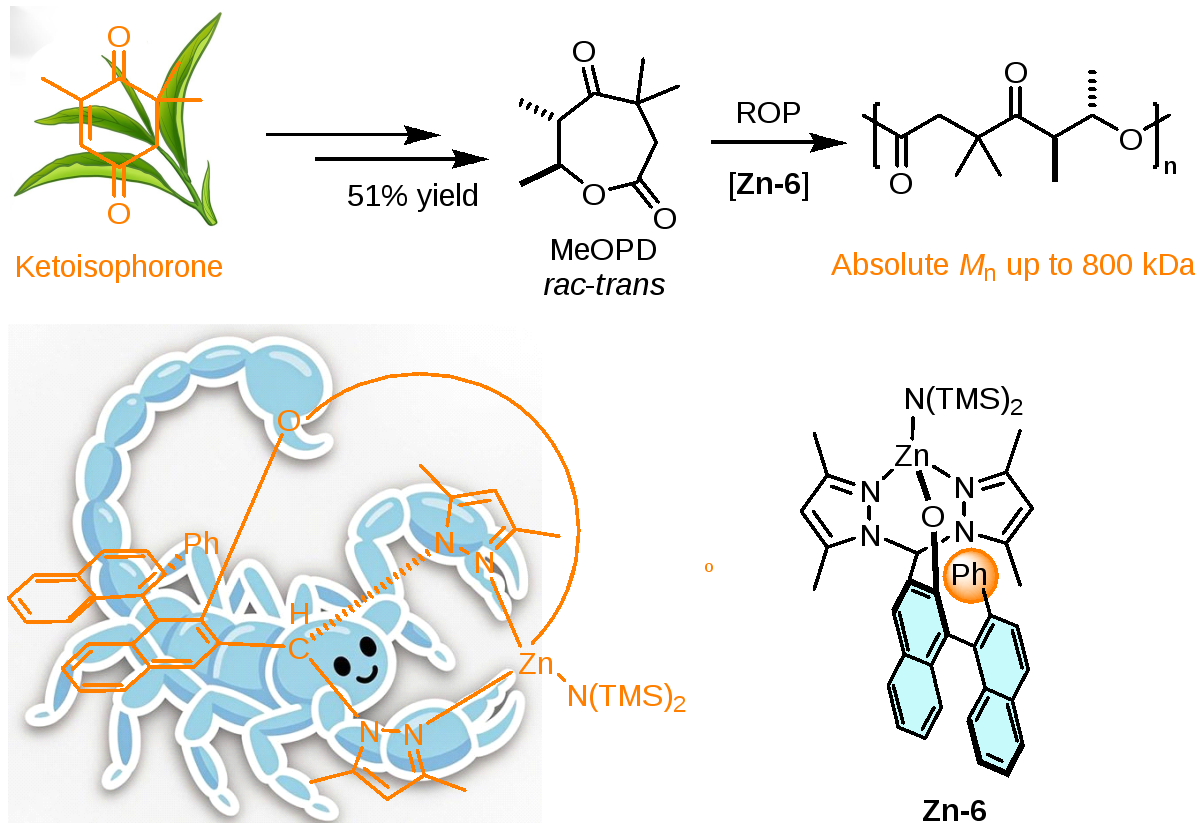 近日,北京大学化学与分子工程学院唐小燕课题组在可持续高分子材料的单体设计与金属配合物催化可控聚合方面取得重要进展。研究团队构建了具有双萘基结构的蝎酸型(C-scorpionate)锌催化体系,实现了对生物基七元环 γ-酮内酯单体的高效开环聚合,并系统阐明了催化剂结构与性能之间的构效关系。相关成果以“Binaphthalene-Modified C-Scorpionate Zinc Catalysts for Ring-Opening Polymerization of Bio-Based γ-Ketolactones to High-Molar-Mass Degradable Polyesters”为题发表在《Angewandte Chemie International Edition》。论文第一作者位化学与分子工程学院的在读博士生熊军文,通讯作者为唐小燕研究员。