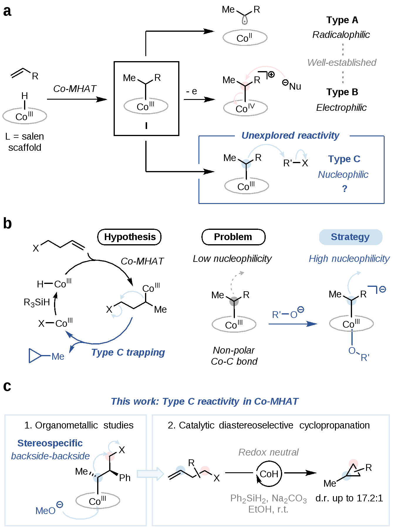 课题组首先通过结构明晰的烷基钴(III)的化学计量实验验证了该策略。随后,该策略被拓展至催化体系,实现了高烯丙基亲电试剂向环丙烷的立体选择性转化,非对映选择性最高可达17.2:1。该反应的实现为CoSalen-MHAT催化中实现Type C型捕捉提供了可行策略,为该领域开拓了新的反应性空间。