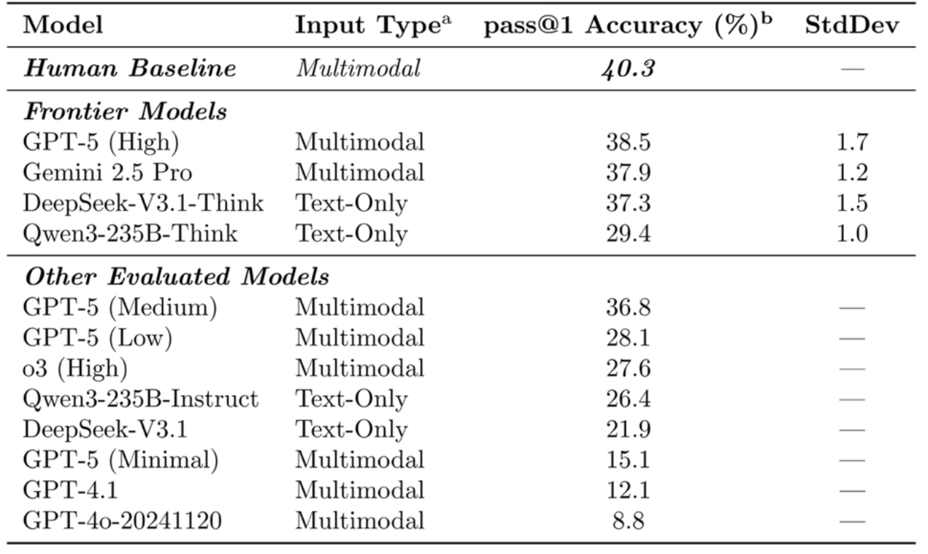 评测结果显示,SUPERChem 具有较高的题目难度和区分度。在北京大学化学专业低年级本科生的闭卷测试中,人类基线准确率为 40.3%。