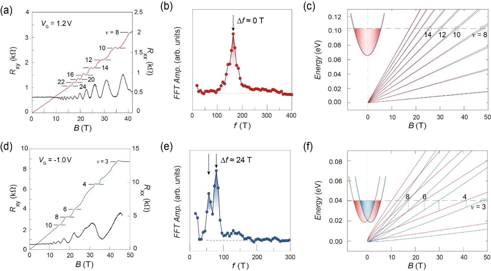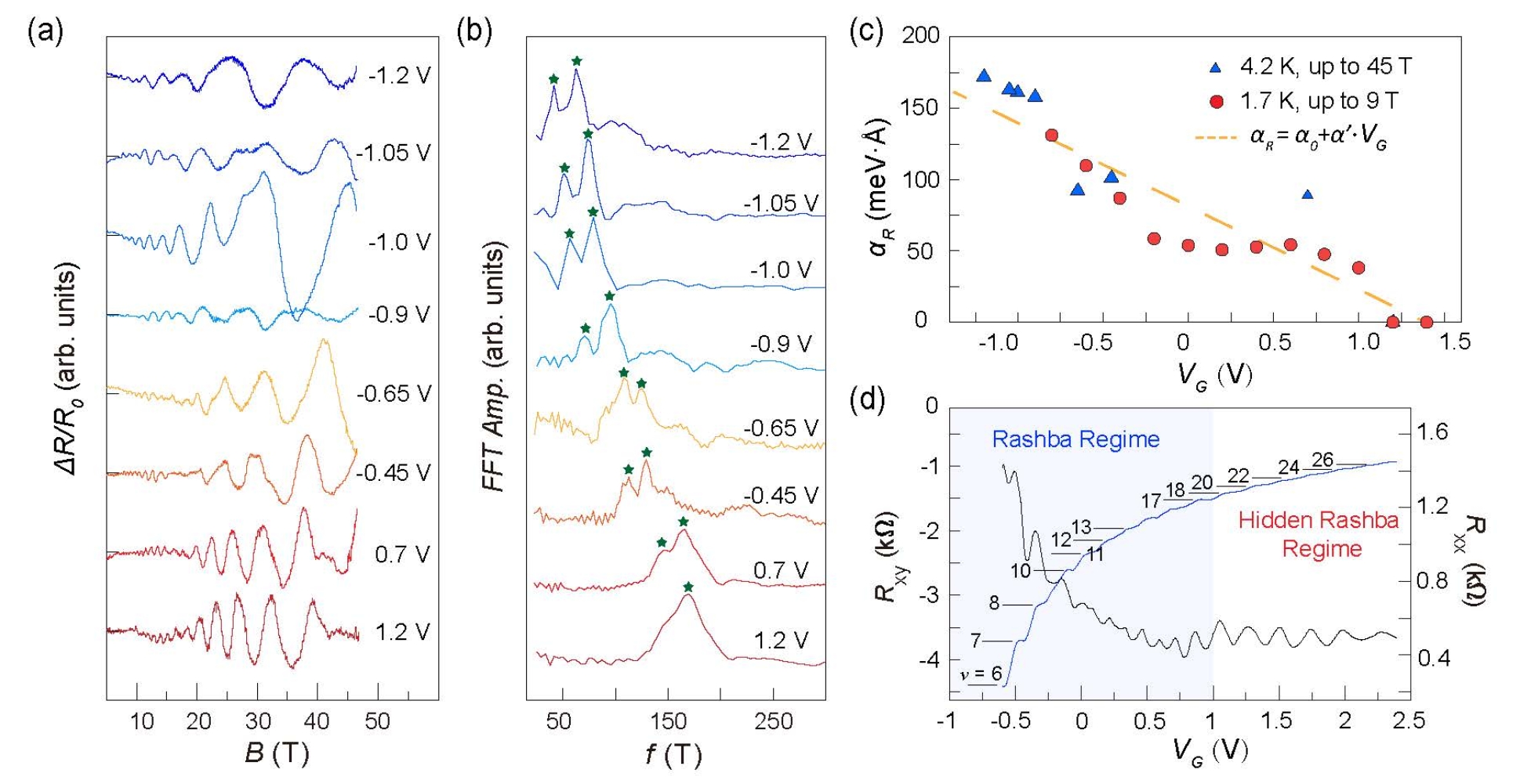 图3. Rashba 劈裂与量子霍尔态的转变过程。(a-b)不同栅压下强磁场中的量子振荡与分析。(c)基于两类磁场下的量子振荡行为得到的 Rashba 参数随栅压调控的线性变化趋势。(d)改变栅压下的连续量子霍尔态转变,可以分为偶数量子霍尔态区域与奇-偶量子霍尔态区域,对应于隐藏 Rashba 和 Rashba 劈裂能带结构。