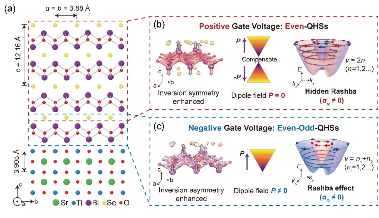 图1. SrTiO3 上外延2 uc Bi2O2Se的Rashba类能带结构。(a)2 uc Bi2O2Se/SrTiO3的晶格结构示意图。(b)在正栅压下,由中心反演对称的[Bi2O2]2+层主导的隐藏Rashba型能带结构与偶数量子霍尔效应。(c)在负栅压下,由中心反演对称破缺的界面 [Bi2O2]2+ 层主导的 Rashba 型能带与奇偶共存量子霍尔效应。
