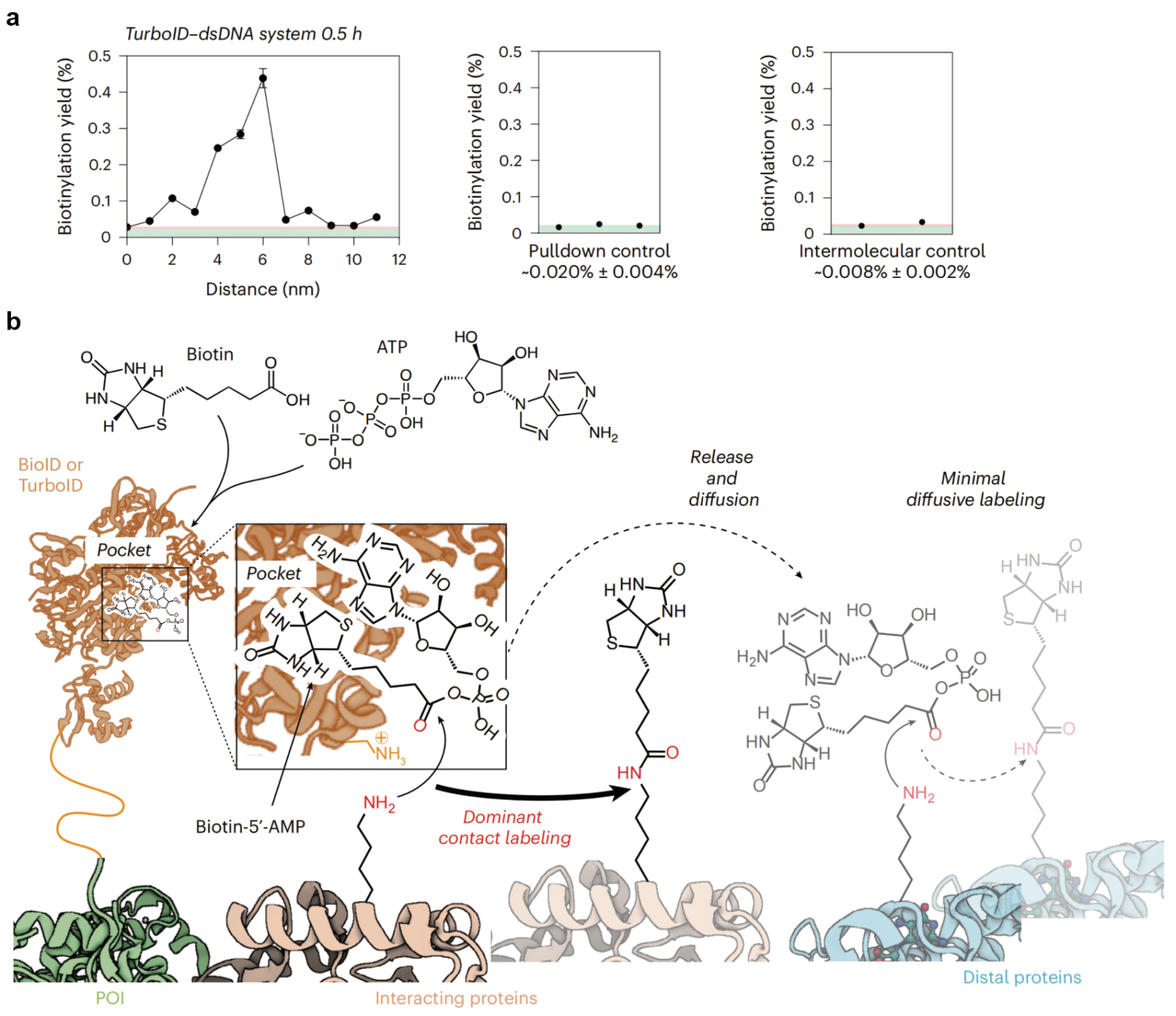 图3. 利用DNA纳米尺平台对TurboID的作用范围进行测量。a. TurboID-dsDNA体系的测量结果。b. 该研究提出的TurboID的标记机制,主要表现出接触标记。