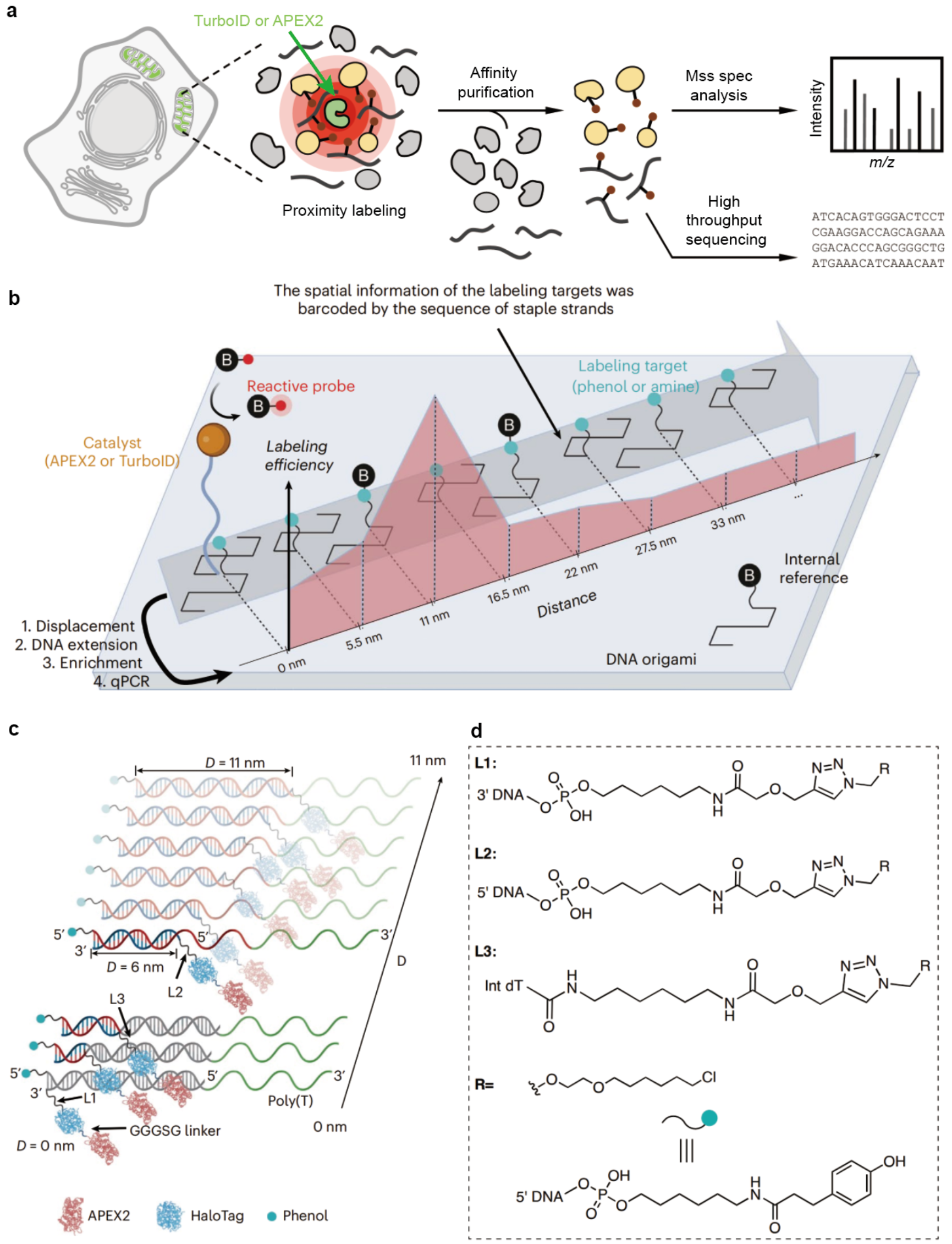图1.构建空间纳米尺平台,测定邻近标记的作用半径。a. 邻近标记工作流程示意图3。图片修改自Zhou Y. et al.,2021。b.利用DNA折纸作为模板体外重构邻近标记系统。c.双链DNA(dsDNA)尺子可以以1纳米的步长控制酶和标记靶标的距离。d.连接子的化学结构。