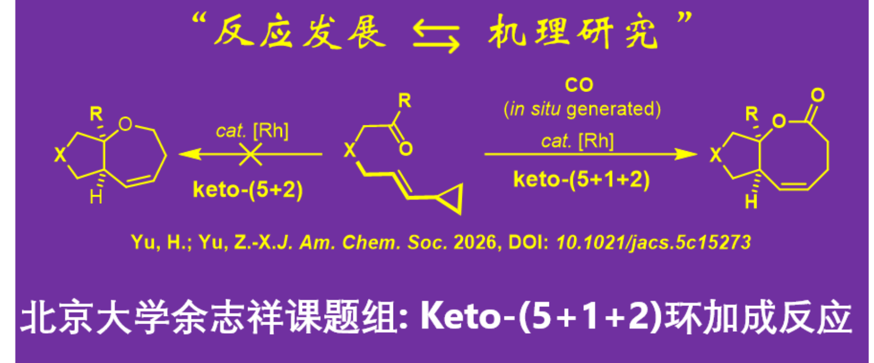 近日,该工作以“Development and Mechanism of Rh-Catalyzed Keto-(5+1+2) Reaction of Keto-Vinylcyclopropanes and CO, and Answering Why Rh-Catalyzed Keto-(5+2) Reaction of Keto-Vinylcyclopropanes Fails”为题发表在J. Am. Chem. Soc. 杂志上。该工作是在余志祥教授指导下由课题组的博雅博士后于海勇完成。感谢国家自然科学基金委、中国博士后科学基金的资助和北京大学高性能计算平台的支持。