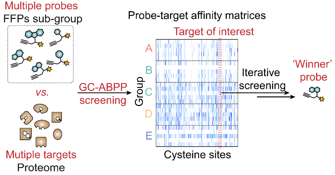 针对上述局限,作者开发了新一代化学蛋白质组学分析平台GC-ABPP,以实现蛋白质组尺度下的“多配体 vs 多蛋白”并行、直接与定量筛选。首先,作者使用完全功能化探针(FFP)替代传统的亲电片段,利用探针修饰肽的质量位移差异实现不同探针修饰靶点的区分,为多探针同时表征提供了可能;随后,作者通过引入还原二甲基化定量策略,对比“对照组”(每个探针单独以高浓度标记一份蛋白质组,然后混合)和“竞争组”(五个探针以等摩尔浓度混合,共同标记一份蛋白质组)中同一探针的标记水平差异,实现精确定量每个探针-半胱氨酸对的“竞争水平”;最后,为了平衡筛选通量与位点覆盖度,并排除组间探针差异带来的假阳性信号,研究者将完全功能化探针库划分为多个亚组进行首轮筛选,绘制初步的探针-靶标亲和力矩阵,并将每组中针对特定靶蛋白的优胜探针挑选出来,重新编组进行多轮迭代筛选,最终筛选出探针库中对靶标蛋白亲和力最高的“冠军”配体。