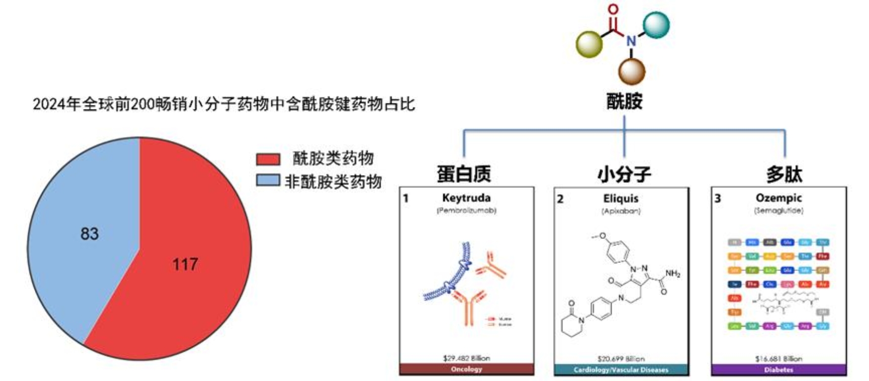 在微观世界里,有一种化学键如同生命的“针线”,将氨基酸缝合成蛋白质,将药物分子编织成治病良方——它就是酰胺键。这个看似简单的“碳-氮-氧”组合,却是生命体系和现代医药的分子基石。目前临床所使用的小分子药物中,超过60%含有酰胺键结构。在药物研发所涉及的化学反应中超过一半以上直接服务于酰胺键的构造(图5)。在过去100多年里,人类认识并掌握建造这座“分子桥梁”的技术,走过了一段充满智慧的旅程。