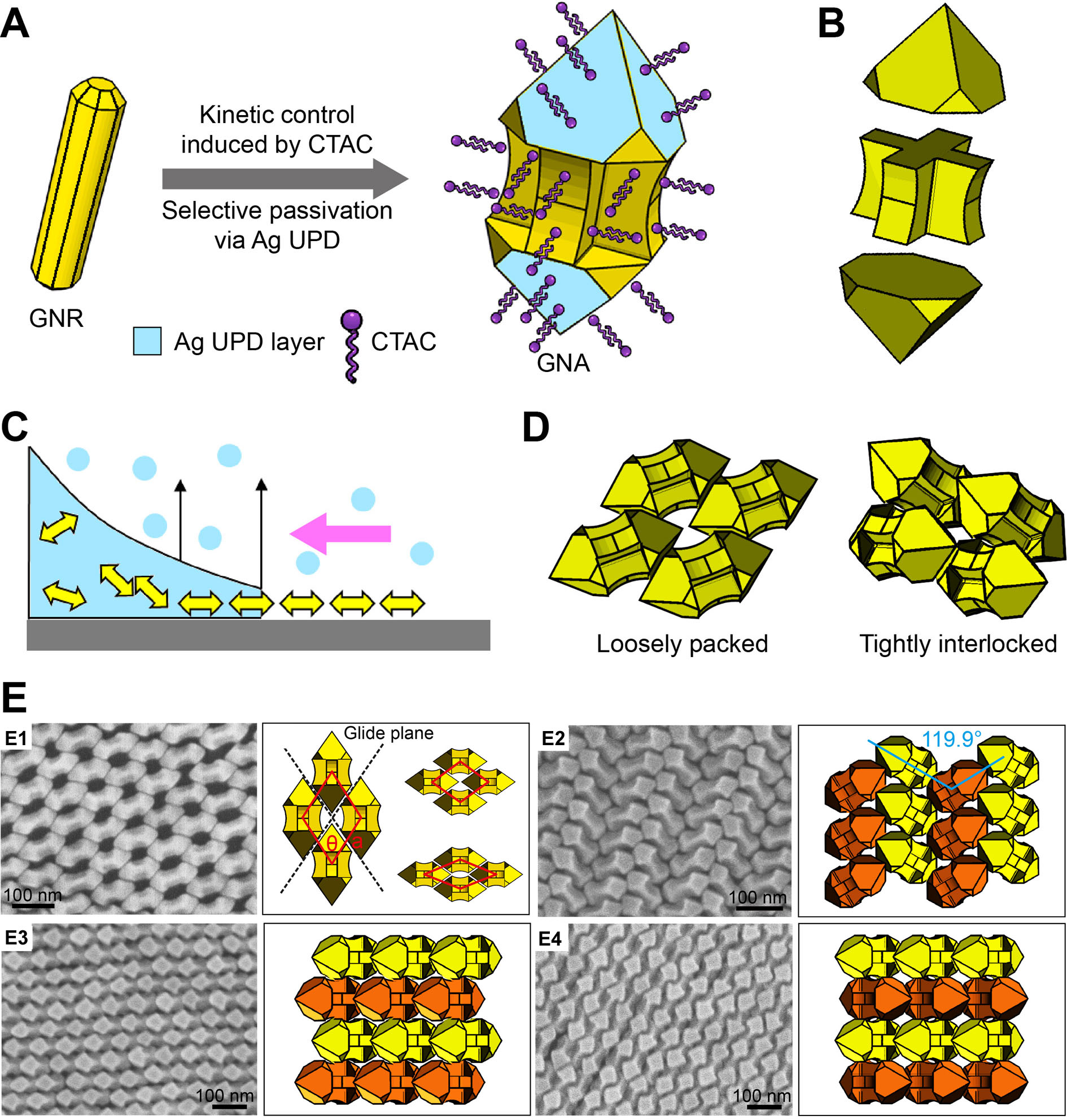 齐利民课题组利用动力学控制生长与选择性表面包覆相结合的策略,通过金纳米棒的二次生长成功实现了单分散的箭头状金纳米晶的可控合成。这种结构新颖的金纳米箭头(GNAs)包含两个金字塔形的端部和一个由十字交叉板块构成的中轴,呈现出一种具有独特互锁能力的凹形结构。该合成过程中,银离子的欠电位沉积有助于获得暴露(111)晶面的金字塔形端部,而表面活性剂CTAC的存在则有助于实现具有特殊凹形结构的中轴的动力学控制生长。由于自身的堆积与互锁能力,GNAs能够在形状引导作用下通过简单的溶剂挥发在基底上组装为疏松堆积或紧密互锁的二维和三维超晶体,它们具有可调的堆积密度及孔结构。这些结构多样、构造奇特的超晶体的形成可归因于熵驱动和形状引导的协同作用。电磁场模拟结果表明,GNAs所构成的等离激元超晶体具有结构依赖的电磁场增强性质和光学性质,呈现出电场分布的独特纳米图案,并表现出显著的偏振依赖光学性质。这类等离激元超晶体在传感和超材料等领域有着潜在的应用价值。该研究工作为具有特异凹形结构纳米晶的控制合成和具有新奇结构及功能的纳米粒子超结构的可控组装开辟了一条新的途径。