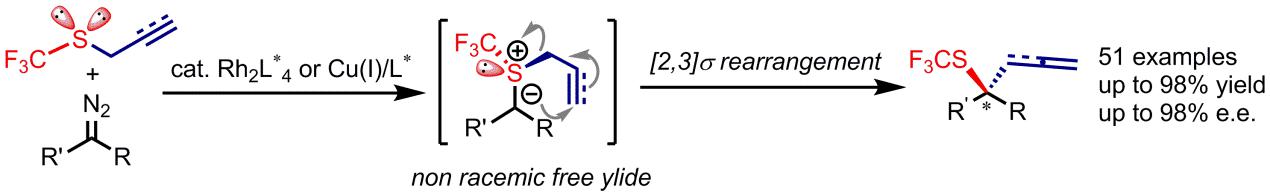 除了过渡金属催化的卡宾偶联之外,该课题组最近在金属卡宾反应的立体选择性控制研究中也取得重要进展,实现了高对映选择性的硫叶立德[2,3]-sigma重排反应(Doyle-Kirmse反应),建立了不对称三氟甲硫基化的新途径。三氟甲硫基(SCF3)由于具有独特的电子性能、高稳定性以及高亲脂性,在药物设计及研发中的重要性日益增加。近年来,如何高效地在药物分子的合适位置引入三氟甲硫基受到了人们的关注。虽然三氟甲硫化的相关合成方法学已经取得了重要进展,但如何对映选择性地引入三氟甲硫基依然存在着诸多挑战。