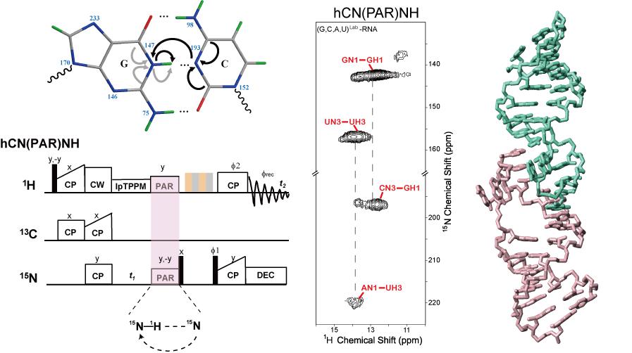 近日,北京大学化学与分子工程学院、北京核磁共振中心王申林研究员课题组首次建立了基于1H检测的、微晶RNA结构分析的固体核磁共振方法。在该工作中,作者结合了PAR(Proton assisted recoupling)传递机制和快速魔角旋转条件下的1H直接检测技术,建立了2D hCN(PAR)NH固体核磁共振实验,并成功实现了检测微晶RNA中Watson-Crick碱基互补配对形成的NH…N氢键这一目标。此方法相对已有的应用于RNA的固体核磁共振方法相比,其灵敏度和分辨率均显著提高,并且在检测碱基之间的氢键作用更加高效。结合同位素稀释技术,2D hCN(PAR)NH固体核磁共振实验被应用于区分二聚体RNA的kissing-loop和extended duplex结构。