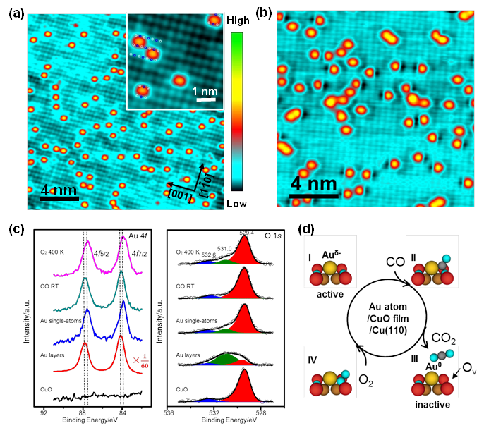 (a) 单层CuO薄膜上制备的Au单原子STM图。(b) CO分子在室温条件下与Au单原子近邻晶格氧形成的氧空穴STM图。(c) CO氧化反应过程中Au 4f和O 1s XPS信号的变化。 (d) Au单原子活化的CO氧化反应机理图。