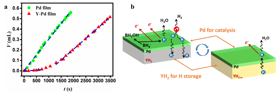 DBFC是一类重要的高能量密度液体燃料电池,其阳极反应是BH4-的氧化,其中氢气的逸出是最大的副反应,造成能量效率的巨大损失。研究人员将Y-Pd薄膜构成储氢/催化双功能电极,利用Y氢化物的可逆储氢性能有效抑制了氢气产生,可使DBFC的能量效率提高40%(图1)。[J. Mater. Chem. A, 2017, 5, 14310–14318.]