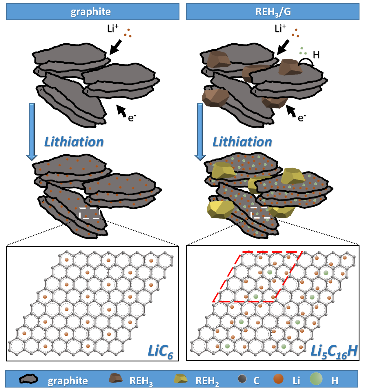 氢化物中的H可以通过电化学过程结合Li+,传统观点认为在储锂过程中H与Li+只能按照1:1的比例形成LiH。但研究人员在稀土氢化物REH3(RE=Y, La, Gd)-石墨的复合体系中发现,通过与石墨的协同作用,H/Li+的比例可以达到1:5,实验表明REH3的加入可使复合体系的比容量达到800mAh/g,并具有非常好的循环性能。如图3所示,活泼氢在插锂过程中作为负电中心,降低插锂后体系的能量,负极的嵌Li结构不再是石墨的LiC6,而是形成了Li5C16H,因此氢化物改性可极大地提高石墨的储锂能力。[Adv. Mater. 2018, 30, 1704353]