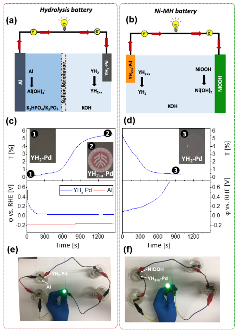 铝水解制氢是一种重要的产氢方式,但铝水解产生的热量甚至超过了生成的氢气所含化学能,高达55%的化学能以热量直接耗散。研究人员利用Y-Pd薄膜电极与Al片构成电池,可将水解的热能转化为电能,水解热能的利用率达到8%-15%,该过程中Y薄膜同步吸氢,首次实现了同步发电和吸氢(图2)。 [Angew. Chem. Int. Ed. DOI:10.1002/anie.20171166, Hot Paper,封底文章]