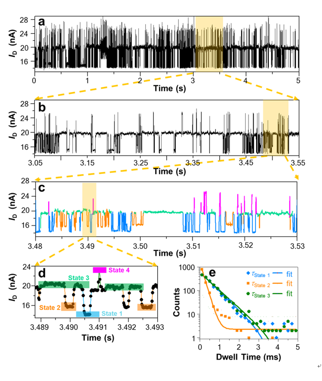 近两年来,北京大学化学与分子工程学院郭雪峰课题组与其合作者利用单分子器件平台开展了一系列单分子本征物性、单分子化学反应动力学和单分子生物物理等方面的系统研究。他们利用石墨烯基单分子器件研制了国际首例稳定可逆的单分子光开关器件(Science 2016, 352, 1443; J. Phys. Chem. Lett. 2017, 8, 2849);观察到了低温下联苯基团由于单键的旋转产生的精细立体电子效应(Nano Lett. 2017, 17, 856);研究了分子间主客体相互作用的动力学过程(Science Advances 2016, 2, e1601113),揭示了羰基和羟胺反应形成酮肟的分子机制(Science Advances 2018, 4, eaar2177),证实了利用单分子电学检测方法研究单分子反应动力学的可行性,为实现单分子化学反应的可视化研究迈出了重要的一步。他们利用硅基单分子器件实现了具有单碱基对分辨率的DNA杂交/托杂交动力学过程的研究(Angew. Chem. Int. Ed. 2016, 55, 9036);在单分子水平上揭示了分子马达水解的动力学过程(ACS Nano 2018, 11, 12789),展现了单分子器件在单分子生物物理研究方面的可靠性。分别应Chem. Rev.和Cell子刊Chem的邀请撰写了单分子器件领域的综述或评论性文章,展示了基于单分子器件的电学检测平台在单分子反应动力学和单分子生物物理等基础研究方面的广阔应用前景(Chem. Rev. 2016, 116, 4318;Chem 2017, 3, 373)。