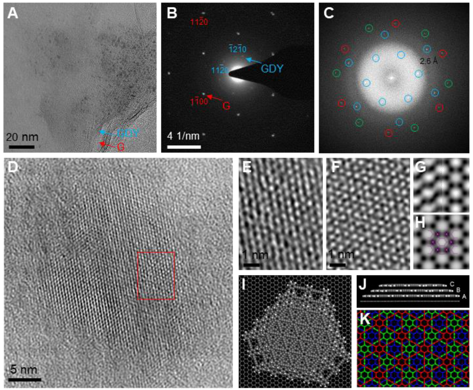 图二:石墨烯上少层石墨双炔薄膜的高分辨透射电镜表征结果,结合理论模拟,确认了该石墨双炔薄膜为ABC堆垛的三层结构。