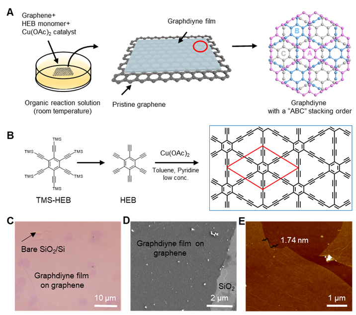 图一:石墨烯上少层石墨双炔薄膜的合成过程及相应的表征结果,薄膜厚度为1.74 nm(包含单层石墨烯的厚度)