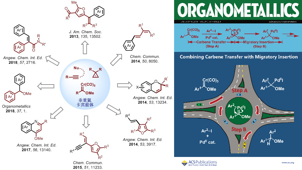 Fischer卡宾是经典的稳定金属卡宾络合物,自1964年Fischer等首次报道以来经过几十年的发展已经成为一类非常重要的有机金属化合物。利用卡宾配体在不同金属之间的转移,课题组发展了一系列钯催化的Fischer铬卡宾交叉偶联反应。例如,他们发展了钯催化的芳基铬卡宾与芳基碘化物的还原偶联反应,通过一系列机理验证实验和DFT理论计算,对该反应的机理进行了深入的探讨,验证了卡宾转移以及钯卡宾的迁移插入为催化循环中的关键步骤(Palladium-Catalyzed Reductive Cross-Coupling Reaction of Aryl Chromium(0) Fischer Carbene Complexes with Aryl Iodides. Kang Wang, Yu Lu, Fangdong Hu, Jinghui Yang, Yan Zhang, Zhi-Xiang Wang, and Jianbo Wang, Organometallics 2018, 37, 1)(被选为封面论文)。