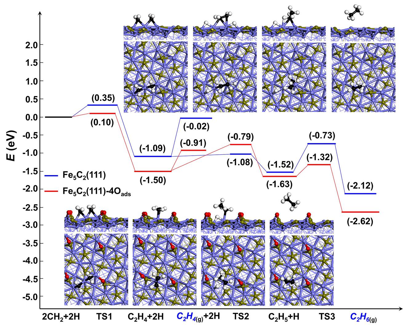 图3. CH2物种在Fe5C2(111)和Fe5C2(111)-4Oads表面耦合和加氢形成C2H6的能量曲线图,以及相应的中间产物结构(Fe,C,O和H原子颜色分别为蓝色,棕色,红色和白色,在CH2物种中C原子颜色为黑色)。