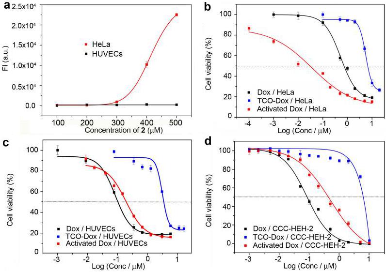 通过靶向肿瘤细胞过表达的磷酸酶,癌细胞与正常细胞得以有效区分。在宫颈癌HeLa细胞内,由于过表达磷酸酶的作用,当前体浓度高于临界组装浓度时,发生超分子自组装,使前药激活开关Tetrazine分子得以在肿瘤细胞内特异富集。而正常细胞HUVECs的磷酸酶水平较低,则不会发生自组装和Tetrazine富集。因此,通过酶触发超分子自组装实现肿瘤细胞靶向(图2a),为进一步在肿瘤细胞内特异激活前药奠定了基础。阿霉素经TCO修饰后的前药TCO-Dox能显著降低细胞毒性,但癌细胞特异富集的Tetrazine分子能够特异激活TCO-Dox,发挥其杀伤癌细胞的作用,显著抑制癌细胞活性(图2 b-d)。