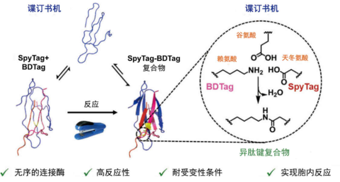 高效的多肽-多肽偶联反应对于制备蛋白-药物缀合物、调控蛋白质拓扑结构、生物成像、化学生物学等领域具有重要的意义,并因其可基因编码的特性而备受关注。目前,研究报道此类连接方法并不太多见,其中分选酶(sortase)或蝶豆粘酶-1(butelase 1)介导的偶联反应具有较好的底物序列特异性,内含肽(intein)介导的蛋白质连接方法可实现可基因编码的高效主链连接,而转谷氨酰胺酶(transglutaminase)则可以介导非特异性的侧链异肽键偶联。近年来,多肽-蛋白质反应对的蓬勃发展为此类工具的发展提供了新的契机。已有谍连接酶(SpyLigase)和探连接酶(SnoopLigase)介导的多肽-多肽偶联体系见诸报道,但其效率仍有待提高,而其细胞内的应用前景仍有待探索。最近,张文彬课题组发展了独特的具有无序结构的谍订书机酶(SpyStapler),可实现谍标签(SpyTag)和北大标签(BDTag)在细胞内和细胞外的高效偶联(图1)。