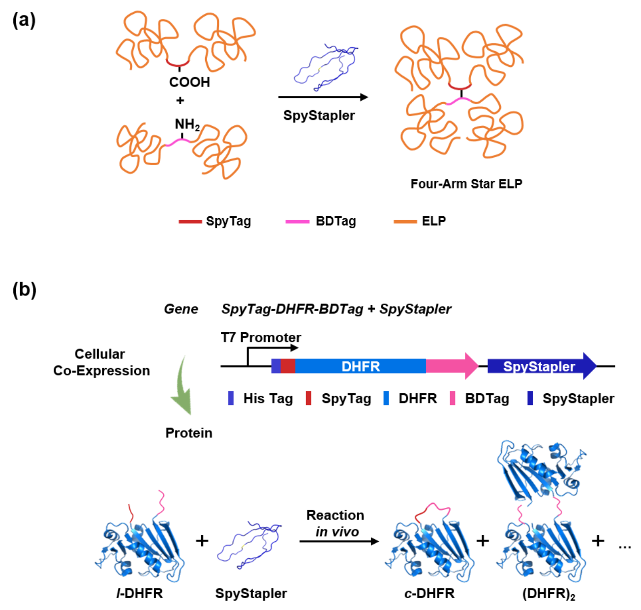 图2. (a)谍订书机酶可介导位于柔性链中的多肽标签之间的偶联,形成四臂星型弹性蛋白;(b)在细胞内共表达反应性DHFR和谍订书机酶,可实现细胞内蛋白质的原位环化。
