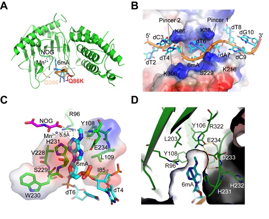 图1 FTO-6mA核酸复合物晶体结构及去甲基酶活分子机制