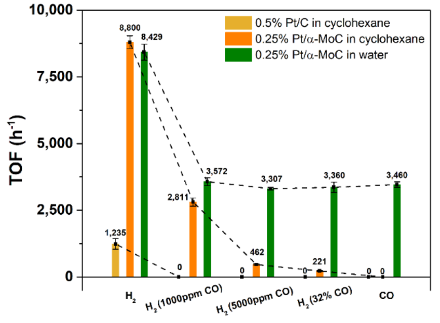 北京大学化学与分子工程学院/工程科学与新兴技术高精尖创新中心马丁课题组与中国科学院大学周武课题组,山西煤化所/中科合成油温晓东课题组合作,通过对Pt/α-MoC 催化剂的电子性质的精确调控,即通过定向控制碳化钼基底和负载于其上的原子级分散的Pt物种间的电子转移,实现对CO与Pt前线轨道相互作用的调变,成功地弱化了CO在贵金属Pt上的吸附。 将该催化剂应用于以含有100-1000 ppm CO的氢气为氢源的硝基苯催化加氢反应中,实现了Pt基催化剂抗CO中毒催化加氢性能,而这是传统Pt基催化剂所不具备的特性。在更具挑战的硝基苯衍生物选择性加氢反应中,该催化剂表现出高效的选择性加氢性能,特别是对硝基苯乙烯和硝基苯乙炔的加氢选择性均高达 > 99.9%,使得反应产物无需再经分离提纯,可减少高阶化学品生产的工序并降低成本。更值得一提的是该催化剂在水为溶剂的催化加氢过程中,实现了全浓度抗CO 中毒的加氢性能,并且维持了较高催化活性(~3400 h-1)和优异的循环稳定性。本研究开辟了利用粗氢,重整气乃至CO+H2O等多种氢源直接用于高效选择性加氢反应的新途径。该研究成果以“A highly CO-tolerant atomically dispersed Pt catalyst for chemoselective hydrogenation”为题于2019年2月25日发表于 Nature Nanotechnology(https://doi.org/10.1038/s41565-019-0366-5.)。