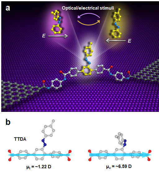 图1:a,偶氮苯单分子器件的结构示意图;b,偶氮苯顺反结构的偶极矩变化