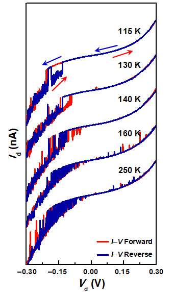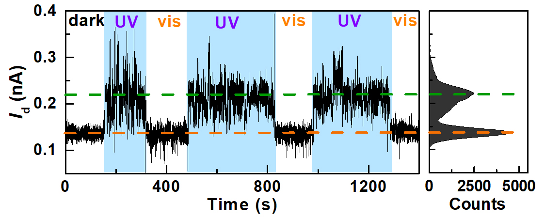实验发现,偶氮苯分子在某一方向的电场下,会发生由反式到顺式的构象变化,即电场会诱导偶氮苯分子异构化(图2)。结合理论计算,他们发现由于反式与顺式结构下偶氮苯分子沿主链方向的偶极矩不同,因此电场对分子能量的调控能力有差异。在某一个电场方向下,随着电场场强的增加,偶氮苯分子顺式结构与反式结构的能量差逐渐减小,继续增加电场强度,顺式结构的能量就会低于反式结构的能量,顺式结构更加稳定。而在相反的电场方向下,顺式结构与反式结构的能量差随着电场强度逐渐增大,反式结构始终是最稳定的结构。与此同时,在低偏压条件下他们还实现了在不同波长的光照下偶氮苯分子在反式与顺式结构之间的可逆调控(图3)。该工作结合实验和理论成功地构建了一类全可逆的光诱导和电场诱导的双模式单分子光电子器件,并首次提出了通过“侧基化学门控”方法实现单分子导电性实时调控的新手段。石墨烯电极和偶氮苯分子间牢固的共价键链接方式使得这些单分子开关器件具有良好的稳定性和可重现性,在未来高度集成的信息处理器、分子计算机和精准分子诊断技术等方面具有巨大的应用前景。