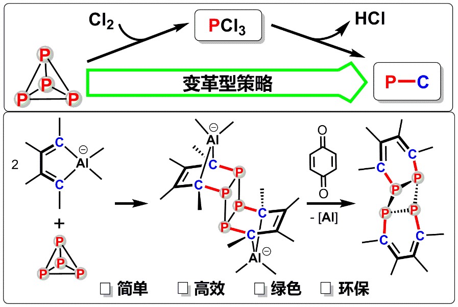 工业上有机磷化合物的起始原料都是从白磷(P4)出发,传统路线需要多步,使用氯气,经由PCl3剧毒化合物,同时释放大量盐酸,对环境污染大。从白磷活化直接合成有机膦化合物,因避开氯气的使用,该过程具有简单、高效、绿色和环保等优点。近三十年来,尽管白磷活化的研究一直被人们所关注并取得了一些进展,但从白磷出发直接构建有机膦化合物存在的主要问题是:反应选择性差;产率底。因此,由白磷直接、高效、高选择性地合成有机膦化合物具有重要的理论意义和应用价值。