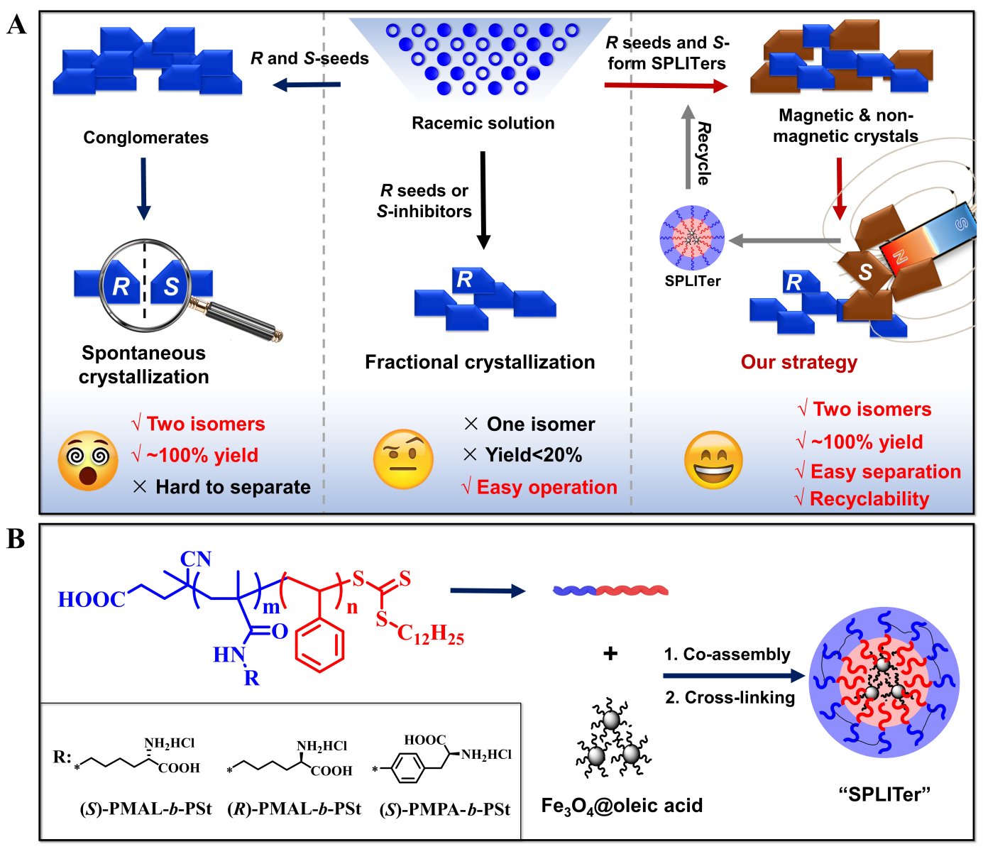 北京大学宛新华教授领导的研究团队结合“优先析晶”和“逆向析晶”思想,通过合理的结构设计,制备了一类由两亲性、手性嵌段共聚物与磁性纳米粒子共组装而成的磁性纳米拆分剂。 在结晶过程初期,该纳米拆分剂起到抑制剂的作用,延缓与其相同构型底物分子的结晶并将其富集在纳米拆分剂周围,而相反构型底物分子的结晶不受影响;在结晶过程后期,被富集在纳米拆分剂周围的对映体分子经奥斯瓦尔德熟化成核并诱导该构型分子结晶并包裹纳米拆分剂。由此,在一次单元操作中可以先后获得一种无磁性晶体和一种有磁性晶体,通过外加磁场可以在固体状态对其进行高效分离。采用冷却结晶和蒸发结晶相结合的方法,可以将单次结晶产率提高至95%以上,且能保持较高的光学纯度(以天冬酰胺为例,R型ee值为99.2%,S型ee值为95.0%)。此外,通过简单的磁场富集便可以回收纳米拆分剂,重复使用多次后仍能保持较好的性能(图1)。用磁铁代替巴斯德的放大镜和镊子,通过类似磁选矿的方式实现外消旋体的手性分离具有重要的应用前景。北京大学宛新华教授为该论文的通讯作者,北京大学博士后叶曦翀博士和德国莱布尼兹新材料研究所崔家喜博士为共同第一作者。