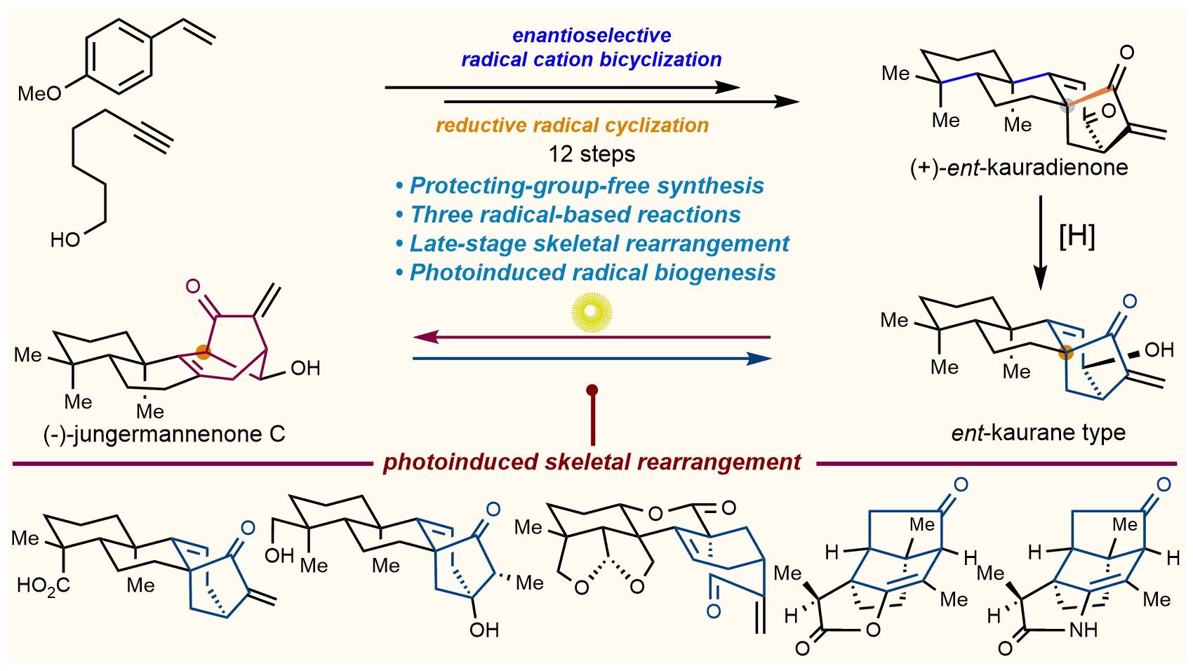 近期,北京大学雷晓光课题组在前期的工作基础之上(Angew. Chem. Int. Ed. 2016, 55, 3112-3116; J. Nat. Prod. 2018, 81, 298−306),在香茶菜属二萜的合成研究中取得一系列新的重要进展,完成了5个香茶菜属二萜分子的首次不对称全合成,并且发现由紫外光或自然光引发的[3.2.1]桥环骨架自由基重排反应可以高效促发二萜类天然产物的骨架重排,从而揭示了该自由基重排,而非传统上认为的碳正离子重排,是该类天然产物可能的生物合成过程。该反应被应用于一系列复杂萜类天然产物或类似物的后期骨架重排中,表明其具有良好的适用性和官能团耐受性。该发现丰富了人们对于萜类天然产物生物合成多样性的认识,而且也为自由基化学在天然产物合成中的广泛应用提供了新的指导思路。研究成果分别在线发表在《Chem》期刊和《Angewandte Chemie International Edition》期刊上。雷晓光课题组洪本科博士、刘伟龙博士和博士生王进为Chem文章的共同第一作者,北京大学余志祥课题组与山东大学娄红祥教授为该研究工作提供了帮助。博士生吴金宝和日本籍博士后Yuichiro Kadonaga博士为Angewandte Chemie International Edition文章共同第一作者。该系列工作得到国家自然科学基金(杰出青年基金、重点项目、和创新群体项目)、科技部重点研发计划、973项目、以及北大-清华生命联合中心的资助。