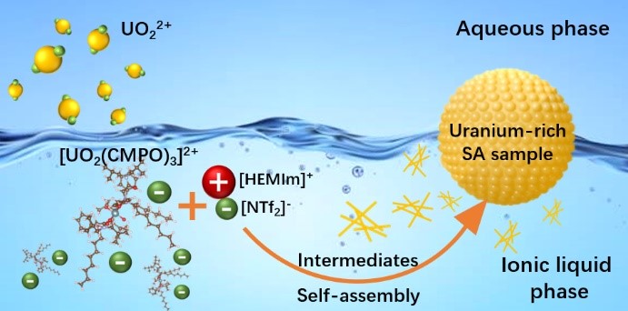 相关研究结果以“Uranium Capture Strategy based on Self-assembly in Hydroxyl-functionalized Ionic Liquid Extraction System”为题,于2019年5月20日发表于英国皇家化学会期刊Chemical Communications上(DOI: 10.1039/C9CC02823D),沈兴海教授与彭述明研究员为共同通讯作者。该研究得到了国家自然科学基金联合基金重点项目“离子液体中镧系元素的配位化学及其痕量离子的萃取研究” 的资助(项目编号:U1830202)。