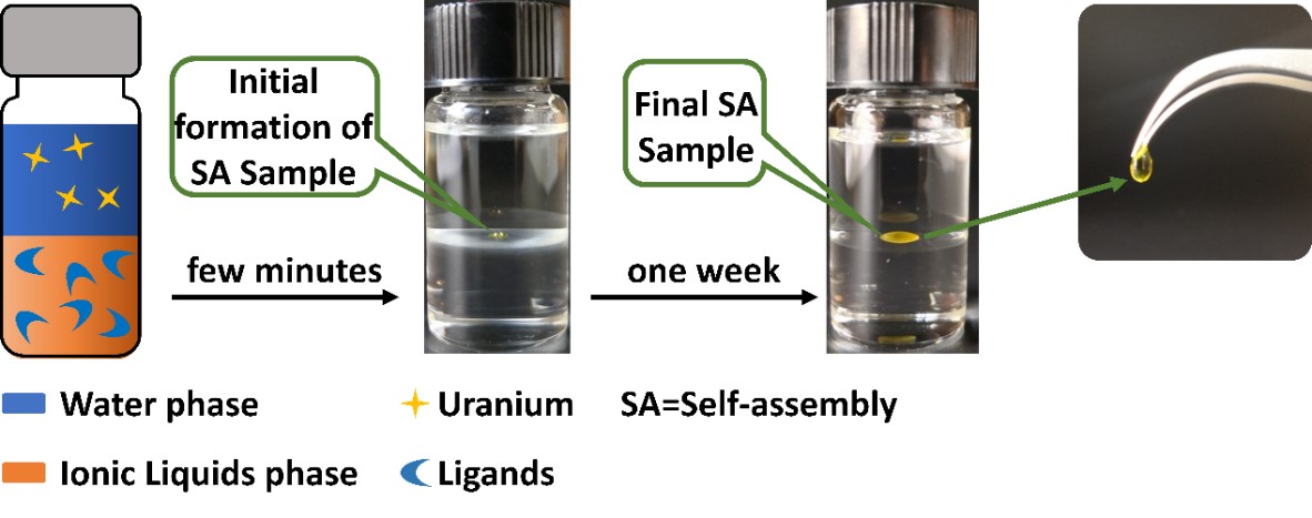 北京大学化学与分子工程学院沈兴海课题组与中国工程物理研究院核物理与化学研究所彭述明课题组合作,巧妙地将宏观超分子自组装的思路设计在萃取体系中,基于羟基功能化离子液体开发了一种新颖、环保、高效的铀萃取分离方法,直接在离子液体-水界面处得到一颗富铀的固体小球,成功实现了水溶液中铀酰离子的一步法提取和固化。该方法在乏燃料后处理、含金属离子废水处理等领域具有重要的应用前景,并有望克服传统溶剂萃取体系流程繁琐、易产生大量放射性有机废液等诸多问题。
