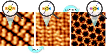 该研究利用1,4-二溴-2,5-二乙炔基苯这一双官能团分子作为反应前驱体。扫描隧道显微镜研究表明,前驱体分子吸附在Ag(111)表面后,两个等价溴代位点在不同温度下分步活化,并参与不同的反应:室温(300 K)下,分子首先选择性地脱去一个溴原子,脱溴位点与氢原子反应;同时,分子中的炔基发生分子间反应,形成由炔-银-炔节点连接而成的一维有机金属链状结构。分子中另一个溴原子的活化需要更高的温度(320~450 K),形成的脱溴位点则与表面银增原子反应生成分子间的有机金属连接,最终得到由炔-银-炔和炔-银-苯两种有机金属节点有序排列而成的二维结构。密度泛函理论计算进一步揭示了非对称反应的机理:分子中两个溴原子解离势垒的差异导致了二者在不同温度下分步活化。较低温度下,炔基的反应提供大量氢原子,促进了脱溴位点与氢的不可逆结合;更高温度下,表面氢原子耗尽,稳定的分子间有机金属产物的形成拉动了脱溴位点与银的反应向右进行。该研究为制备复杂的分子纳米结构和高分子提供了新思路。
