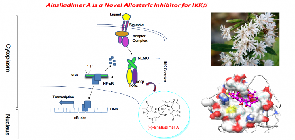 Aberrant activation of NF-kB is associated with the development of cancer and autoimmune and inflammatory diseases. IKKs are well recognized as key regulators in the NF-kB pathway and therefore represent attractive targets for intervention with small molecule inhibitors. Herein, we report that a complex natural product ainsliadimer A is a potent inhibitor of the NF-kB pathway. Ainsliadimer A selectively binds to the conserved cysteine 46 residue of IKKa/b and suppresses their activities through an allosteric effect, leading to the inhibition of?both canonical and non-canonical NF-kB pathways. Remarkably, ainsliadimer A induces cell death of various cancer cells and represses in vivo tumour growth and endotoxin-mediated inflammatory responses. Ainsliadimer A is thus a natural product targeting the cysteine 46 of IKKa/b to block NF-kB signalling. Therefore, it has great potential for use in the development of anticancer and anti-inflammatory therapies.
