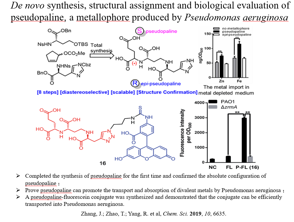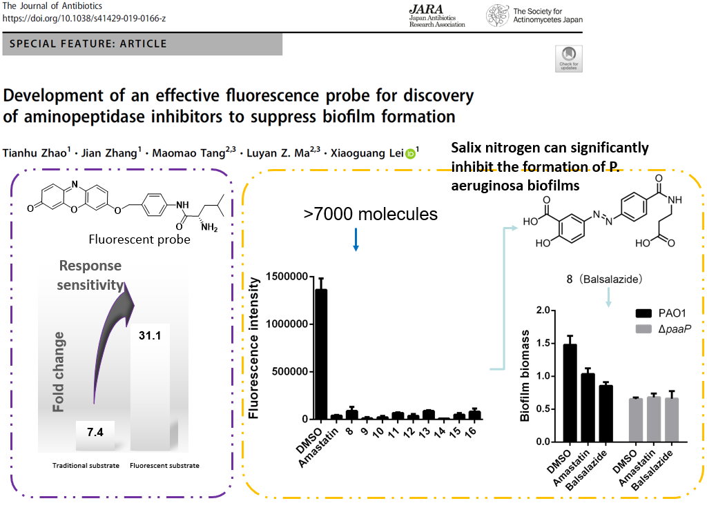 Pseudomonas aeruginosa aminopeptidase plays an important role in biofilm formation and is a potential target for the prevention and treatment of P. aeruginosa infection. Traditionally, L-Leu-p-nitroanilide was used as the substrate for aminopeptidase activity, which was not sensitive enough. The L-leucine was linked to an oxazolone-based "on-off" fluorescent probe to synthesize a fluorescent probe for detecting aminopeptidase activity. The signal intensity change before and after the reaction with the fluorescent probe is up to 31 times, which is significantly better than traditional substrates, and can meet the needs of high-throughput screening. Using this fluorescent probe, nine new aminopeptidase inhibitors were screened from more than 7,000 small molecules. Among them, balsalazide can not only inhibit aminopeptidase activity, but also exhibit good biofilm inhibition ability. Since balsalazide is a marketed drug, its safety has been verified. In the future, it can be used in combination with antibiotics to explore more efficient ways to control P. aeruginosa biofilms. |