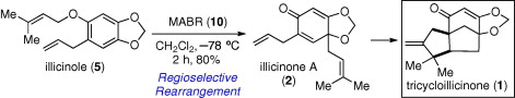 The Letter describes a short and biomimetic synthesis of tricycloillicinone, which was found to enhance the action of choline acetyltransferase (ChAT). The synthetic route has two critical reactions: bulky, oxygenophilic methylaluminum bis(4-bromo-2,6-di-tert-butylphenoxide) (MABR) promoted rearrangement of prenyl phenyl ether and photochemical cyclization. Furthermore, experiments were designed to explore the process of MABR-promoted rearrangement. It was found that the stereochemistry of deuterium labeled prenyl group was only partially scrambled, which suggests that there may be two possible reaction pathways involved in this process. It also suggests that the direct migration of prenyl group to para-position under these conditions is slightly favored over the Claisen-Cope process. The highly efficient synthetic route also provides important new opportunities to explore the biological behavior of tricycloillicinone. ? 2008 Elsevier Ltd. All rights reserved.