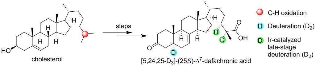 Abstract: Steroid hormones play significant roles in both worms and mammalians. (25S)-Δ7-Dafachronic acid (Δ7-DA, 1) is a member of dafachronic acid hormonal series which regulates both development and lifespan of C. elegans. Despite its importance, effective tools for the illumination of its mode of action are lacking. Herein, we report an efficient synthesis of trideuterated Δ7-DA, [5,24,25-D3]-(25S)-Δ7-dafachronic acid (Δ7-DA-d3, 2), as a useful chemical tool for subsequent biological studies. Key steps for this bioinspired synthesis approach include site-selective aliphatic C-H oxidation mediated by methyl(trifluoromethyl)-dioxirane (TFDO), and the iridium/phosphine-oxazoline catalysed late-stage asymmetric deuterium reduction.