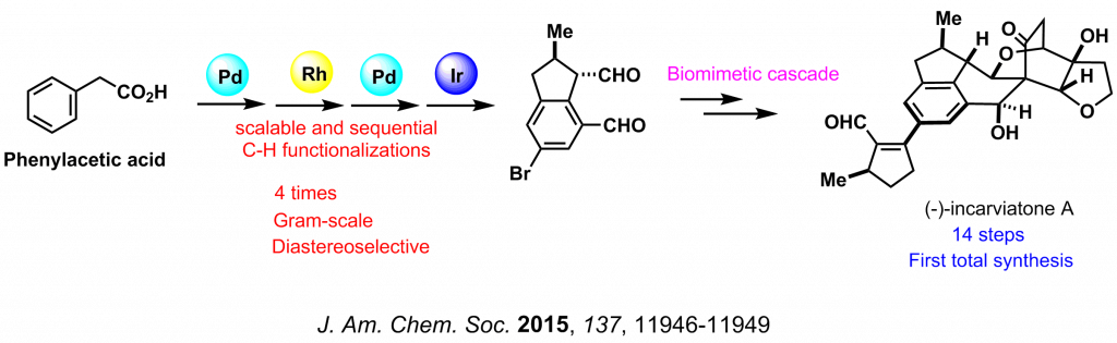 Abstract: We report herein the first total synthesis of (-)-incarviatone A (1) in 14 steps starting from commercially available inexpensive phenylacetic acid (9). Our early-stage synthesis relies on the scalable and sequential C-H functionalization to rapidly assemble the indanyl dialdehyde framework. Further biomimetic cascade strategy allows us to obtain the natural product in a one-pot […]