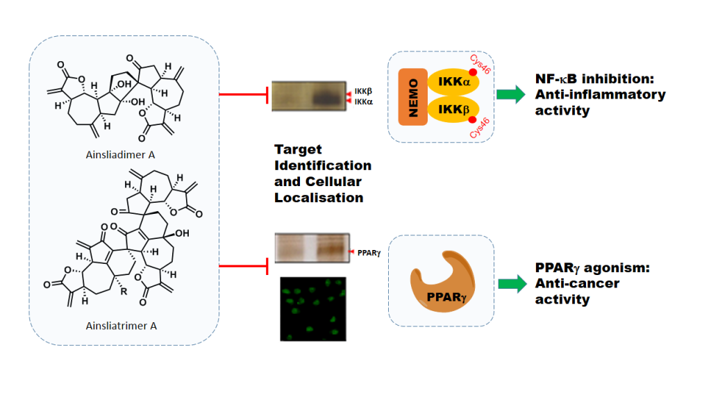 In this highlight we describe two case studies from our laboratory, involving the biomimetic syntheses and the biological mechanism elucidation of the bioactive oligomeric sesquiterpenoids, (+)-ainsliadimer A (4) and (?)-ainsliatrimer A (5). Ainsliadimer A possesses potent anti-inflammatory activity by inhibition of the NF-κB signalling pathway?via?binding at a previously untargeted allosteric site. (?)-Ainsliatrimer A induces apoptosis in cancer cells by activation of PPARγ. Furthermore, we highlight a new bioorthogonal ligation (TQ-ligation) developed in our laboratory which facilitates the target identification of complex natural productsvia?pre-target fluorescence imaging and affinity chromatography. Generally, this paper will discuss the complete process from total synthesis to biological studies of complex natural products, and from the establishment of new bio-orthogonal chemistry to successful target identification. Our approach provides a systematic and efficient methodology for addressing the challenge of natural product target identification.